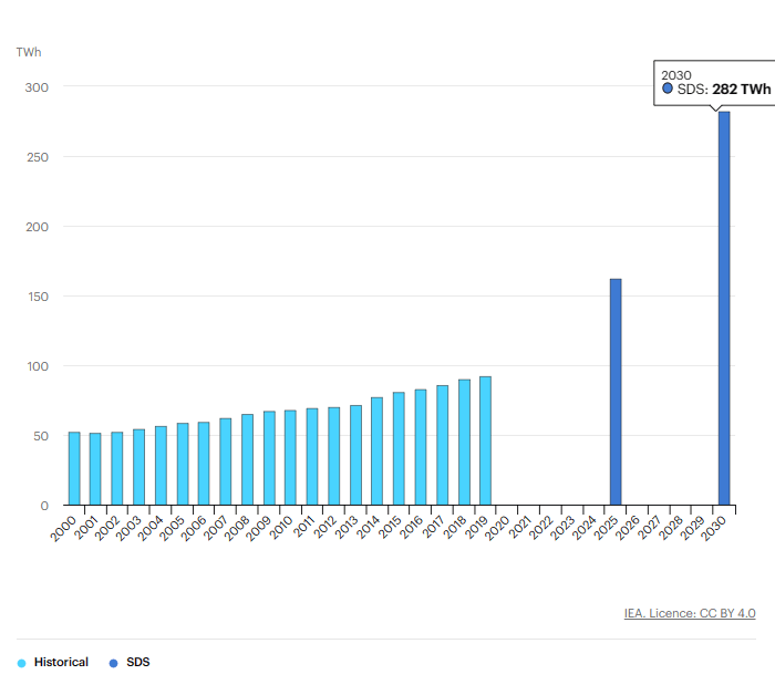 There are multiple sources of growth projections for geothermal energy. For example, the International Energy Agency (IEA) forecasts geothermal power generation of 282 TWh in 2030 in the Sustainable Development Scenario.